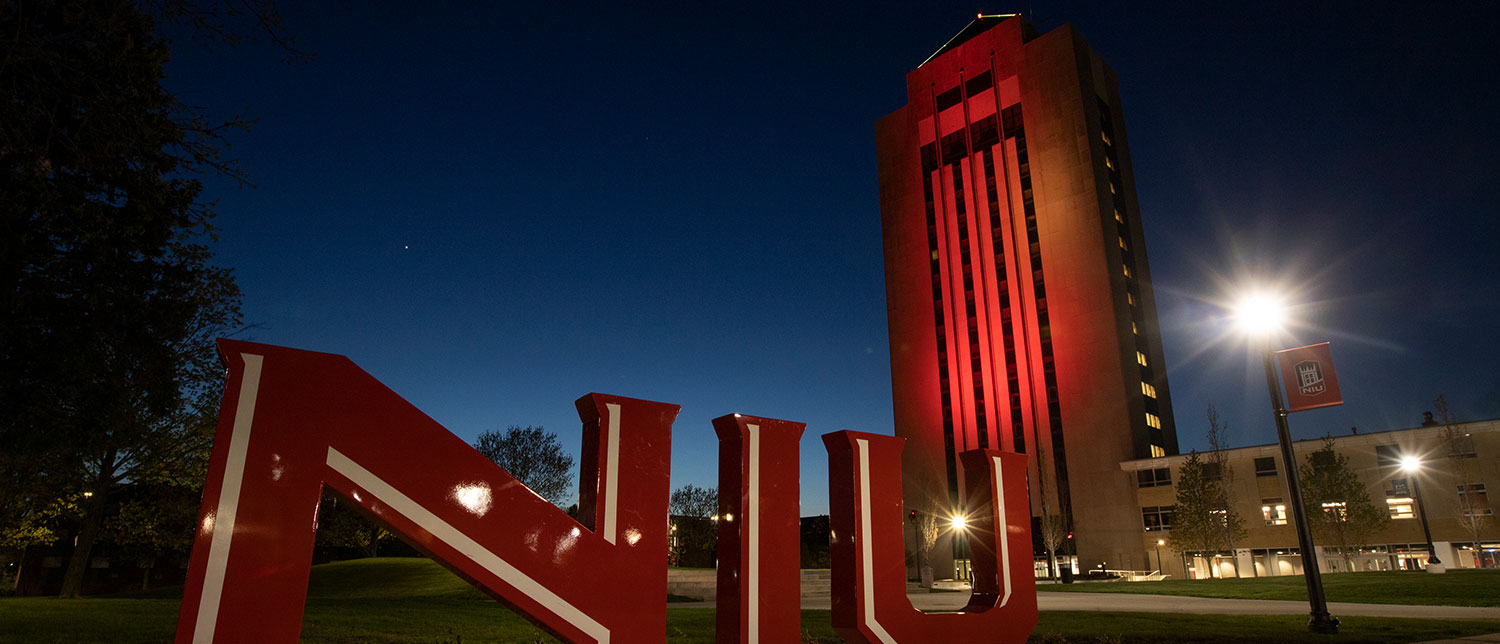This effort is grounded in the mission, vision and values of the university. The iconic Holmes Student Center (HSC) tower can be seen for miles in every direction around the DeKalb area. The standard lighting on the tower is white, but when special events or accomplishments occur, we light the tower up in Huskie red so the entire community knows there’s cause for celebration at NIU.